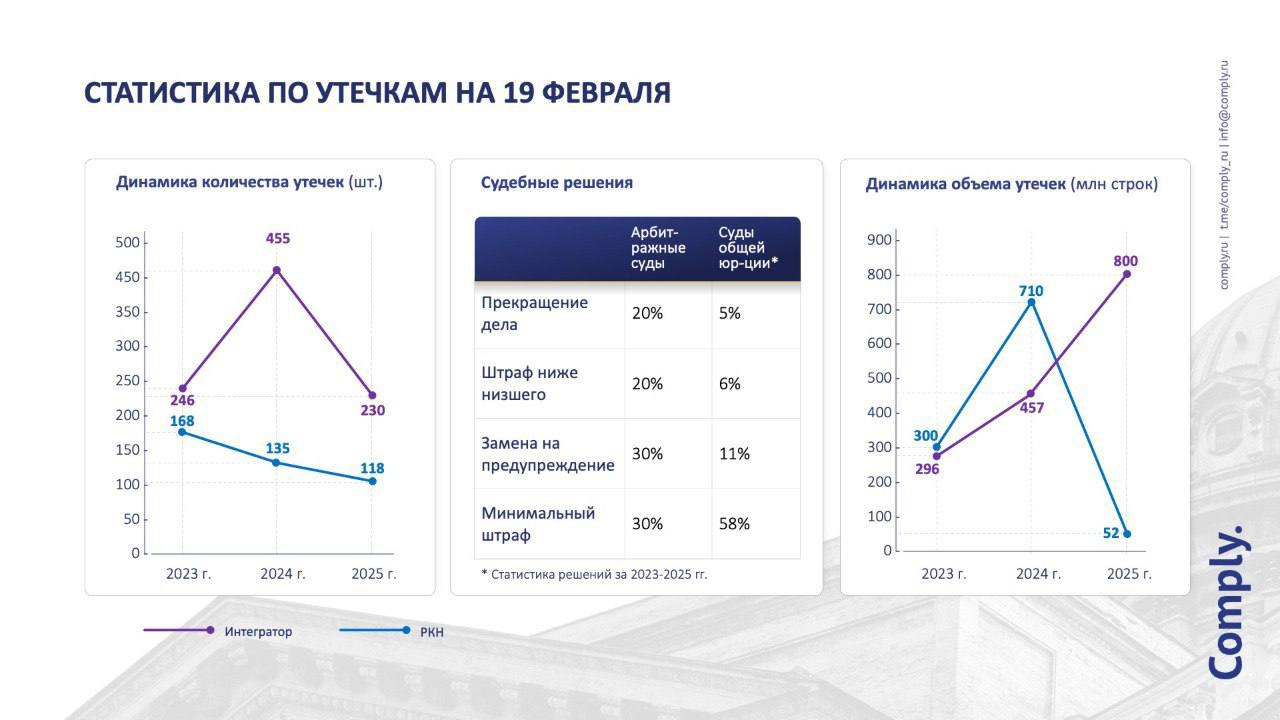 Объемы утечек тоже существенно разошлись. По данным интеграторов в 2025 г. утекло около 800 млн записей, а по информации РКН – 52 млн лишь. А годом ранее – наоборот: РКН зафиксировал 710 млн против 457 млн у F6. Хотя InfoWatch насчитал аж 1,58 млрд! Неразбериха. Об этом далее опрос – ваше мнение интересно!